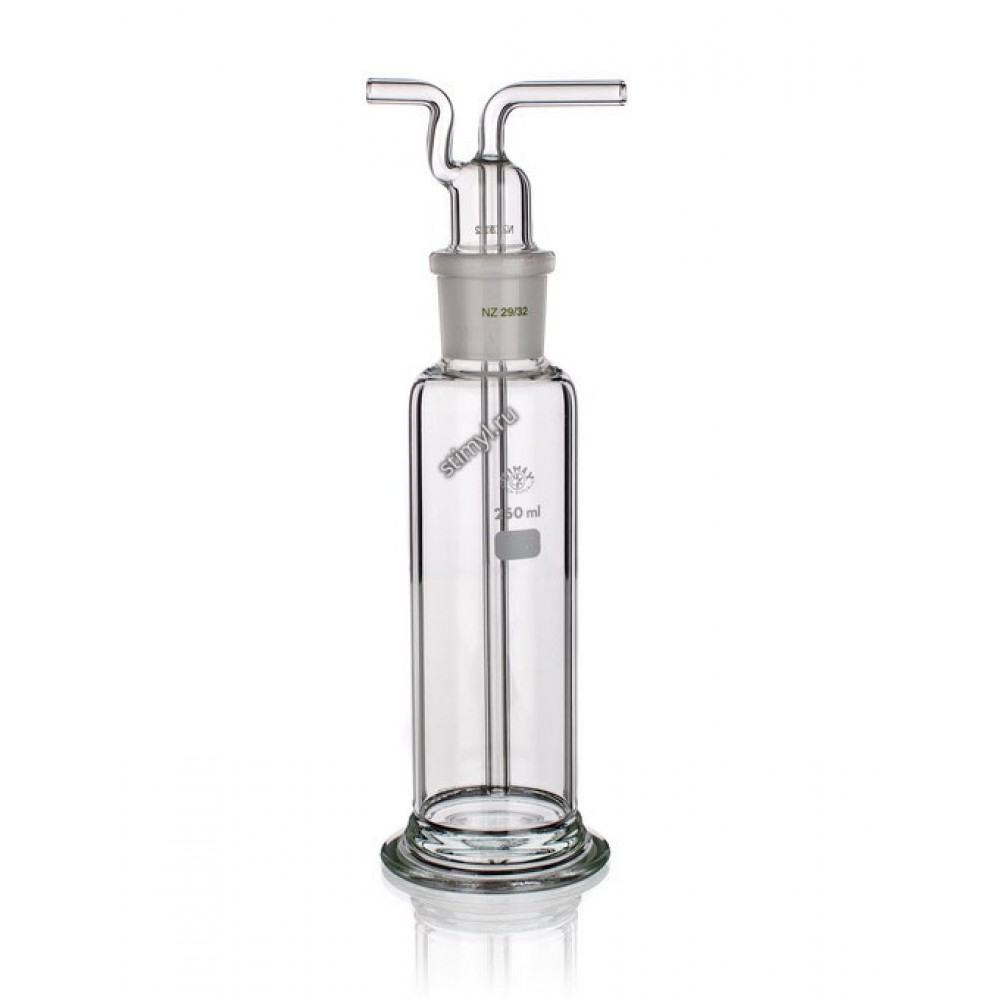 Склянка Дрекселя Simax служит для промывки и просушки газов и представляет собой цилиндр со стеклянной пробкой, через которую проходят две трубки; одна из них соединяется с источником газа и доходит до дна, а вторая короткая, служит для отвода промытого или осушенного газа. Склянку Дрекселя наиболее часто применяют в лабораторной практике. Промывную жидкость наливают в склянку до 1/2 ее высоты, а трубку, доходящую почти до дна склянки, присоединяют к источнику газа. Более эффективное промывание газа достигается либо созданием перегородки внизу склянки из пористого стекла, либо приплавлением к нижнему концу центральной трубки пластинки или цилиндра из пористого стекла, которая обеспечивает тонкое дробление пузырьков газа.