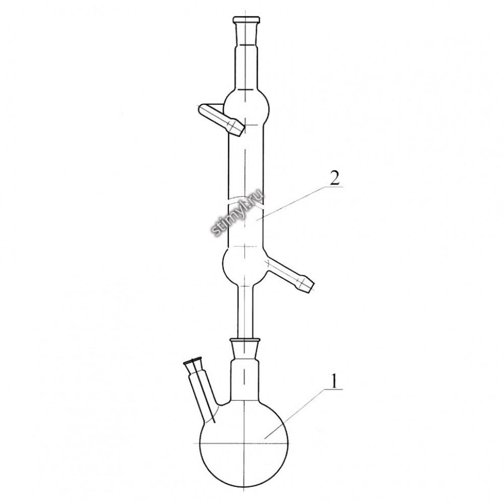 Соединенных между собой с помощью шлифа конического взаимозаменяемого КШ 14/23 по ГОСТ 8682-93.Горловина бокового отвода колбы выполнена под резиновую пробку 14,5 по ТУ 38 1051835-88.Габаритные размеры, мм – 90х 64х420Шифр – 1025
