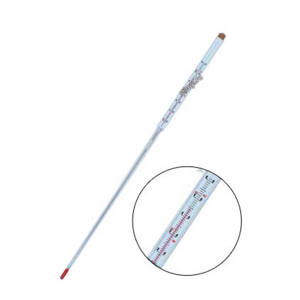 Термометр ТС-6 для измерения температуры при протравке семян. Термометр ТС-6 — термометр стеклянный жидкостный не ртутный с вложенной шкальной пластиной из стекла молочного цвета. Термометр полного погружения.При измерении температуры погружается в измеряемую среду до отметки отсчитываемой температуры на шкале. При перегреве без разрушения термометр может выдержать температуру выше верхнего предела по шкале не более 20°С.Термометр предназначен для измерения температуры при протравке семян. Внесен в Государственный реестр средств измерений и имеет «Сертификат об утверждении типа средств измерений».КОНСТРУКЦИЯТермометр с вложенной шкальной пластиной из молочного стекла.ТЕХНИЧЕСКИЕ ХАРАКТЕРИСТИКИ